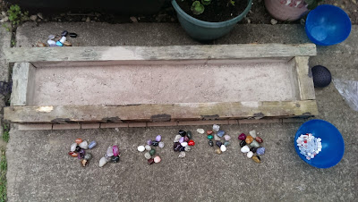 Once they were all in the right place, I had to water the crete lightly to get it to set. And set it did! Some of the stones were moved by the water so i had to add a layer on top to hold the stones in place. The biggest problem was the mosaic tiles didnt really stick at all, which was a pain.